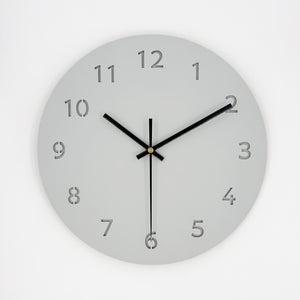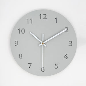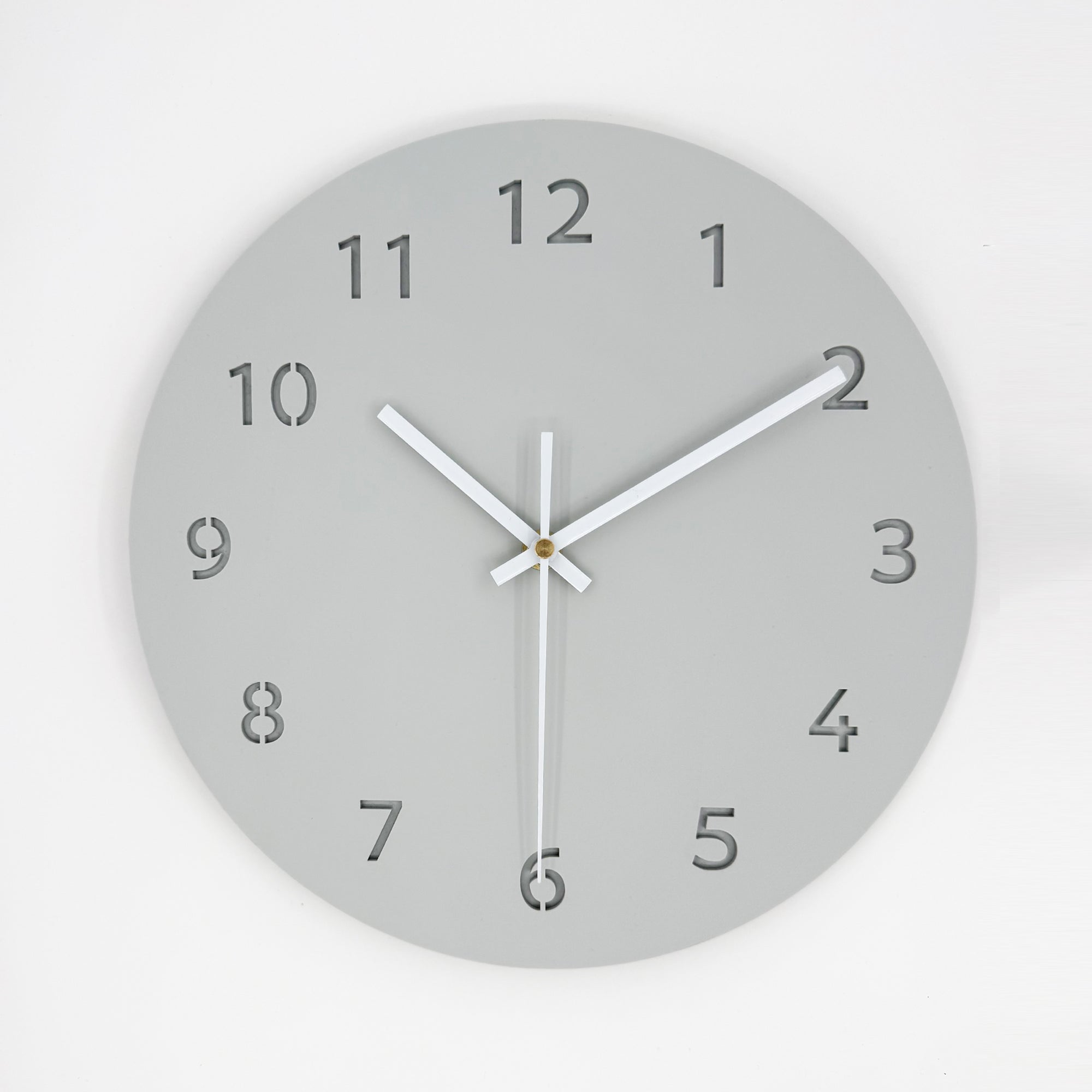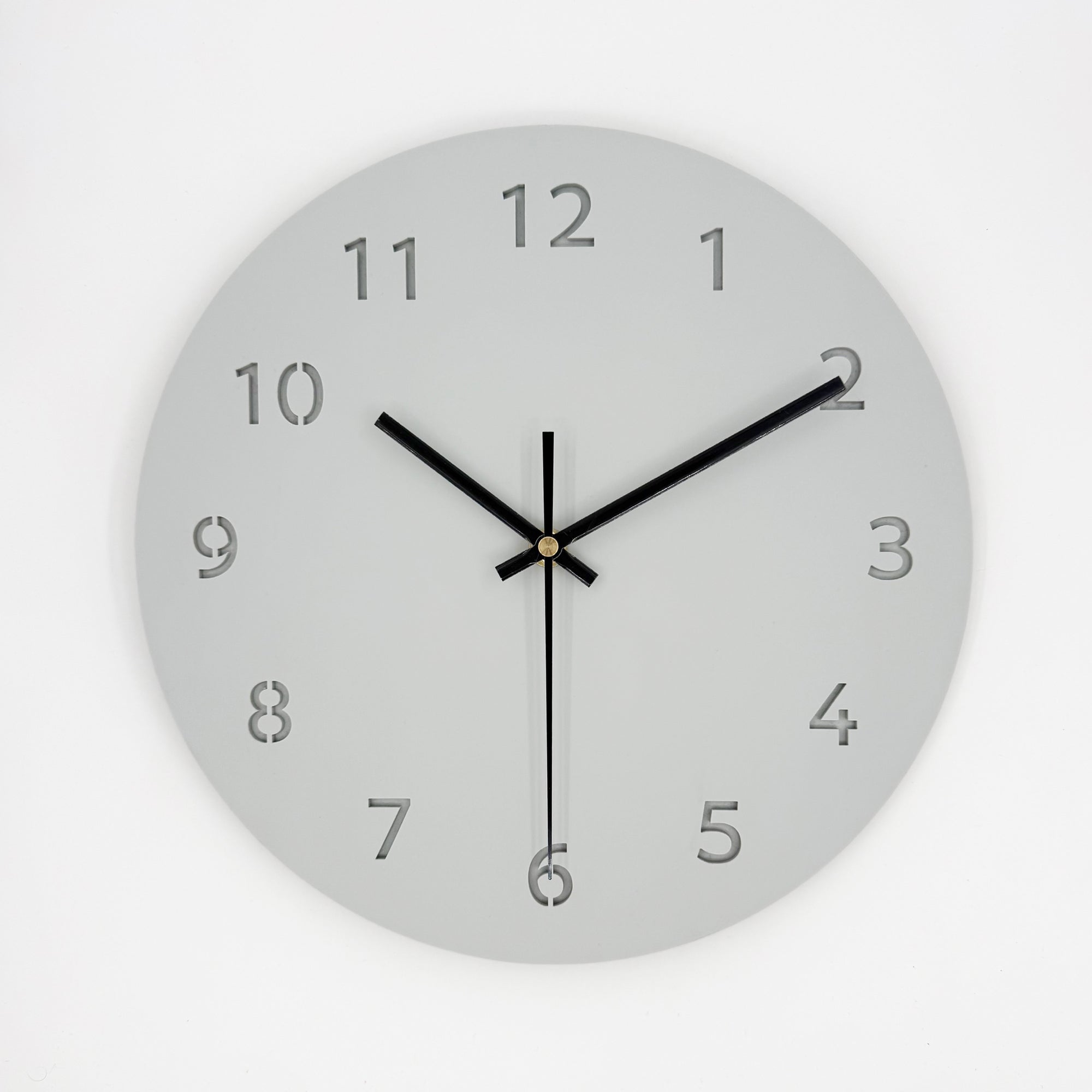 שעון קיר לבית בעיצוב מינימליסטי בצבע אפרפר מט עם מספרים שקועים